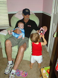 Last week, my mom went out of town so Pop (my Dad) said he'd come over and help out/play with the babies. Thursday, he spent the whole afternoon with us. Like from 1 until 7 when Brett got home. He got to witness an afternoon for me with 2 babies: all the diaper changes, feedings, nap, playtime, dinner, and bathtime. It was nice to have an extra set of arms/hands to hold or play with a baby. He's pretty cute with Emma Kate & baby J! BTW, the next day he called me and said he was worn out!! haha